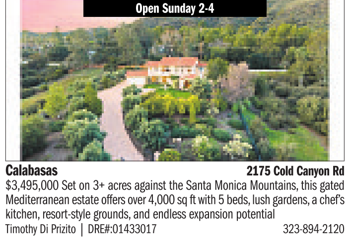 $3,495,000 Set on 3+ acres against the Santa Monica Mountains, this gated Mediterranean estate offers over 4,000 sq ft with 5 beds, lush gardens, a chef’s kitchen, resort-style grounds, and endless expansion potential
