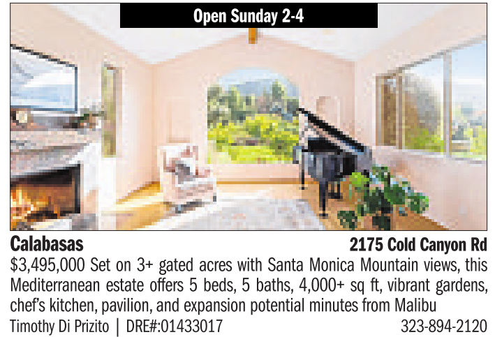 $3,495,000 Set on 3+ gated acres with Santa Monica Mountain views, this Mediterranean estate offers 5 beds, 5 baths, 4,000+ sq ft, vibrant gardens, chef’s kitchen, pavilion, and expansion potential minutes from Malibu