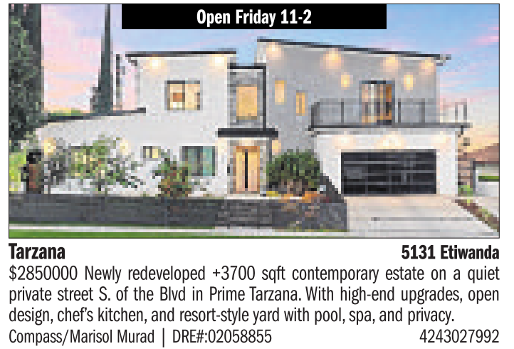 $2850000 Newly redeveloped +3700 sqft contemporary estate on a quiet private street S. of the Blvd in Prime Tarzana. With high-end upgrades, open design, chef’s kitchen, and resort-style yard with pool, spa, and privacy.